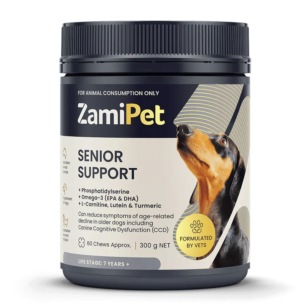 Revitalize your senior dog's health with ZamiPet's delicious, breakable chews, packed with Omega-3, Turmeric, CoQ10, and L-Carnitine to support immune, eye, heart, and brain health—it's like a fountain of youth in every bite!